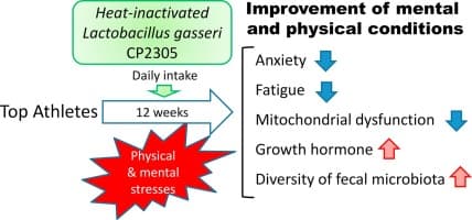 La ingesta diaria de Lactobacillus gasseri durante el mismo período fue eficaz para recuperarse de la fatiga (post) y aliviar la ansiedad y el estado de ánimo depresivo en 49 estudiantes universitarios varones de entre 18 y 22 años durante un período de entrenamiento vigoroso (ensayo clínico).