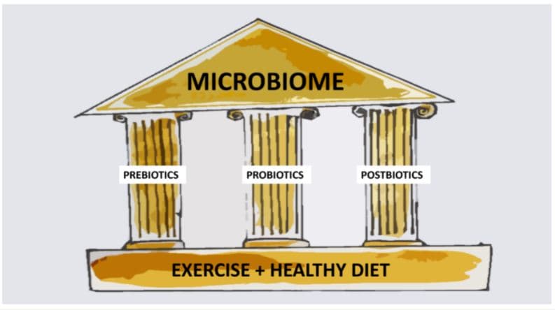 El techo, que representa el microbioma, permanecerá estable siempre que las estructuras a continuación sean sólidas. Ejercicio y una dieta adecuada —un estilo de vida saludable— son la base de la construcción. Los conectores (pilares) entre el techo y la base que cementan la construcción son los pre, pro y posbióticos. Aunque la composición del microbioma también se ve afectada por otros factores que no aparecen en esta figura; el uso de medicamentos/antibióticos, por ejemplo.