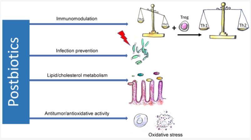 Mecanismos de acción de los posbióticos: modulación del sistema inmune, prevención de infecciones, metabolismo de lípidos/colesterol, actividad antitumoral/antioxidante. Fuente.