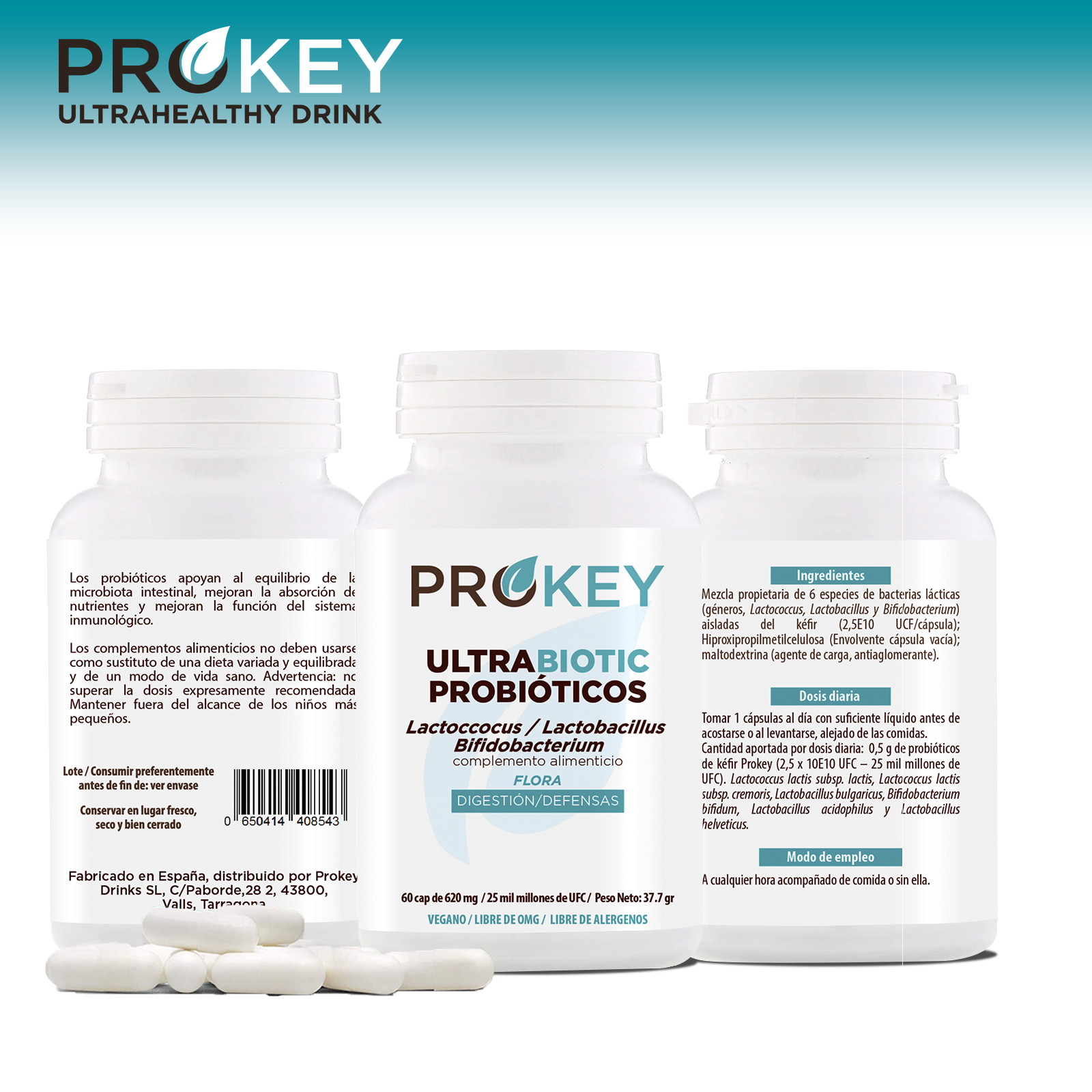Producto de suscripción, cada dos meses te mandamos un envase a tu domicilio, envío gratuito. Cancela cuando quieras. Complemento alimenticio de Prokey: 60 CÁPSULAS de 25 mil millones de UFC. Mezcla de probióticos altamente concentrada que contiene diferentes cepas de bacterias lácticas. Tomada a diario contribuye de forma natural al equilibrio de la flora intestinal, la mejora de las digestiones y el fortalecimiento del sistema inmune. Cada cápsula contiene 25 mil millones de bacterias lácticas de 8 cepas probióticas de Bifidus, Lactobacillus y Lactococcus. ¡Cada envase de probióticos Prokey ULTRABIOTIC contiene 60 cápsulas, suficiente para dos meses!
